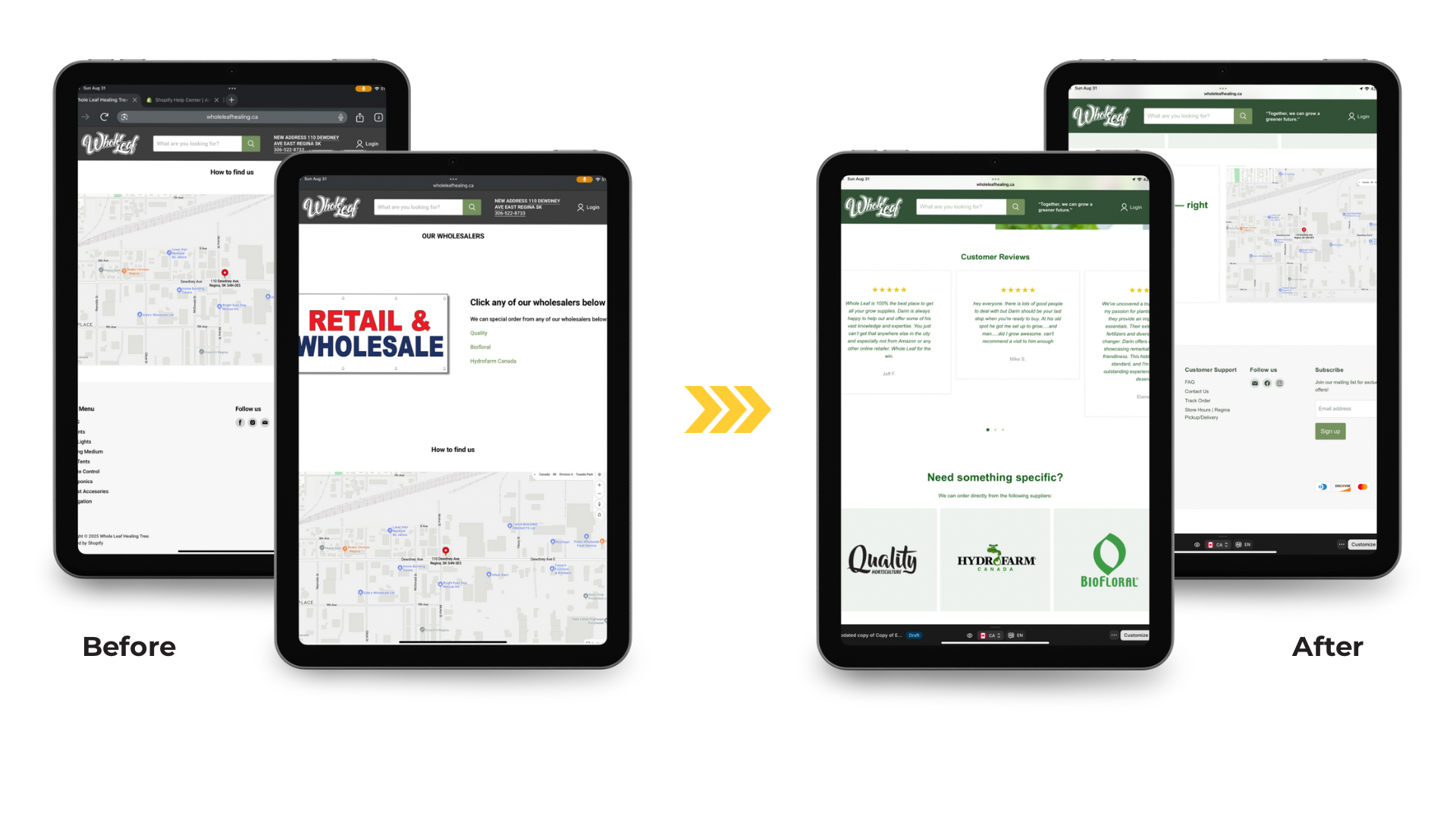 For my portfolio piece, I worked on the Whole Leaf website, a local hydroponics store. My role was to enhance the site’s user experience by improving content layout, store hour visibility, and delivery information.